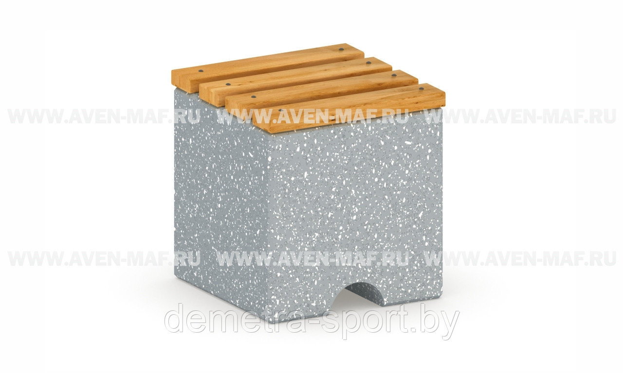 Комплектация: Скамейка на фибробетонном основании, основание выполнено в виде куба, снизу основания имеется выемка в бетоне. Настил скамейки деревянный, четыре доски расположены на равном расстоянии друг от друга, доски обработаны специальной пропиткой для сохранения естественного цвета дерева.