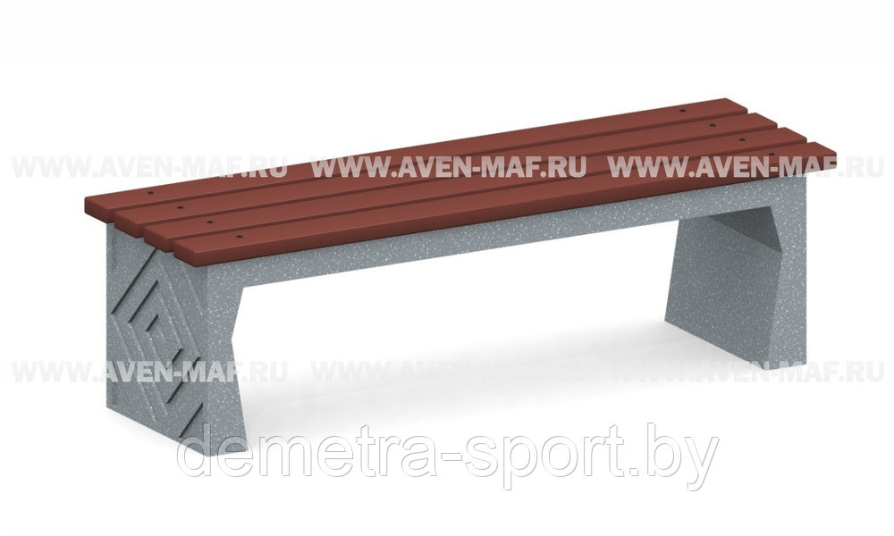 Комплектация: на двух фигурных ножках закреплено сидение из четырех досок, расположенных на расстоянии друг от друга. Скамейка предназначена для благоустройства территорий.