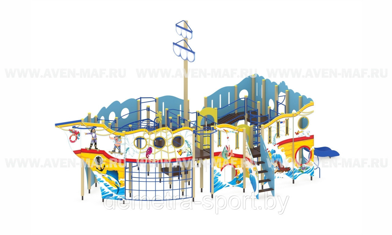 Игровой комплекс Г-73/2 м Пираты представляет собой игровой комплекс для тематических игр и физического развития предназначен для детей в возрасте от 6 лет. Комплекс представляет Пиратский корабль. Комплекс позволяет детям окунутся в историю пиратства и ощутить себя настоящим покорителем морей. Изделие представляет собой сборно-разборную каркасную конструкцию из деревянных столбов, установленных на забетонированные стойки.