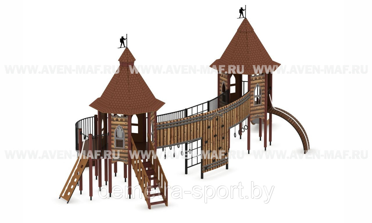 Игровой комплекс Г-802 Крепость - детский-игровой городок в стиле Древней Руси. Комплекс предназначен для активных игр детей возрастом от 6 до 12 лет. Стойки комплекса выполнены из деревянного бруса, окрашены лаком, элементы из влагостойкой фанеры, окрашенной в коричневые цветы. Цвет комплекса подобран как цвет древних крепостей в Древней Руси. В составе комплекса имеется горка, лазы, переходы.