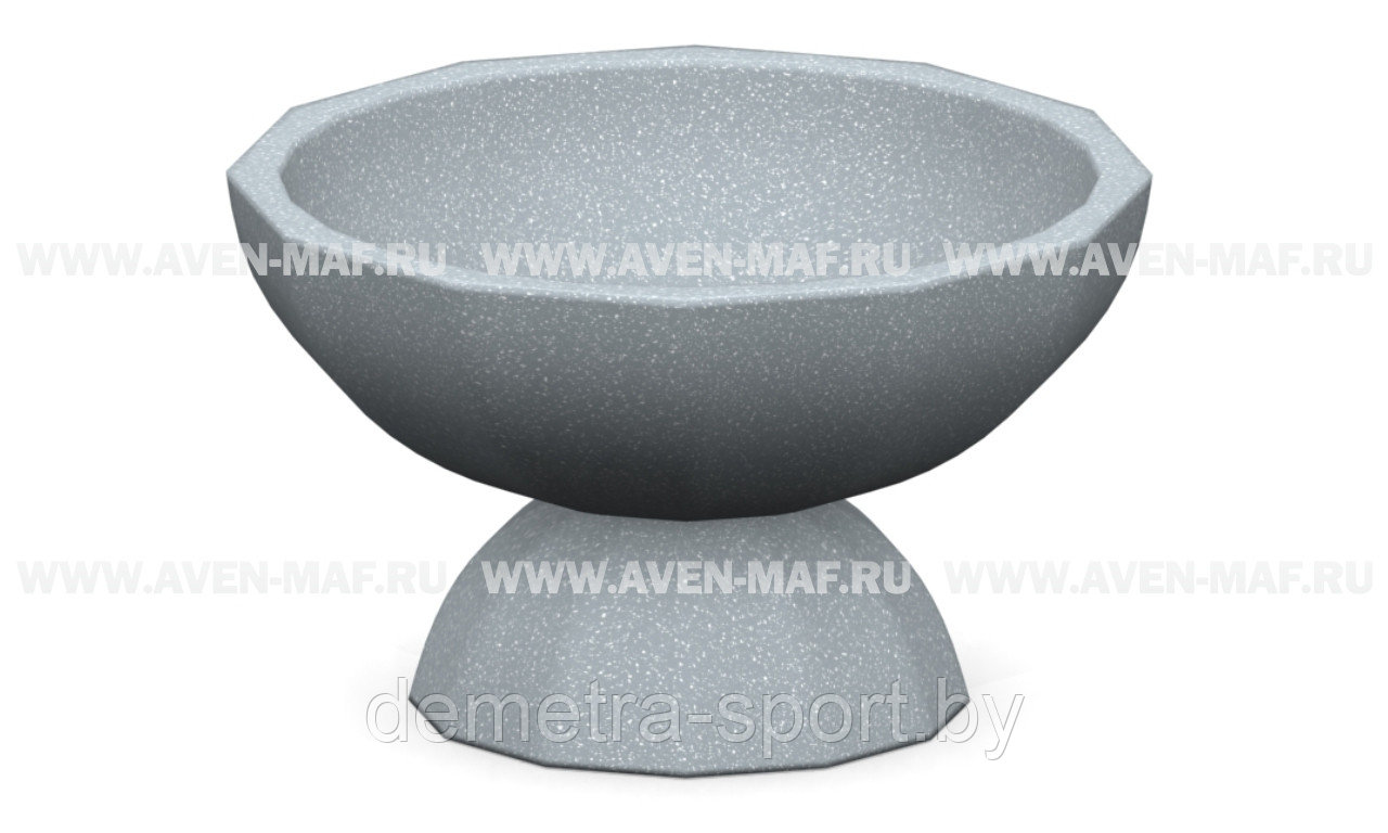 Материалы: Для изготовления вазона используется цемент марки М-500 с добавлением речного намывного кварцевого песка (фракция 2-5 мм), щебня гранитного (фракция 5-20 мм) и фибры (цемент М-500, бетон марки В20 - В32). Конструкция не предполагает использования каркаса из арматуры за счет увеличения количества фибры. Изделие отлито, ошкурено, оштукатурено, еще раз ошкурено, покрыто грунтовкой по бетону и окрашено водно-дисперсионной краской на акриловой основе.
