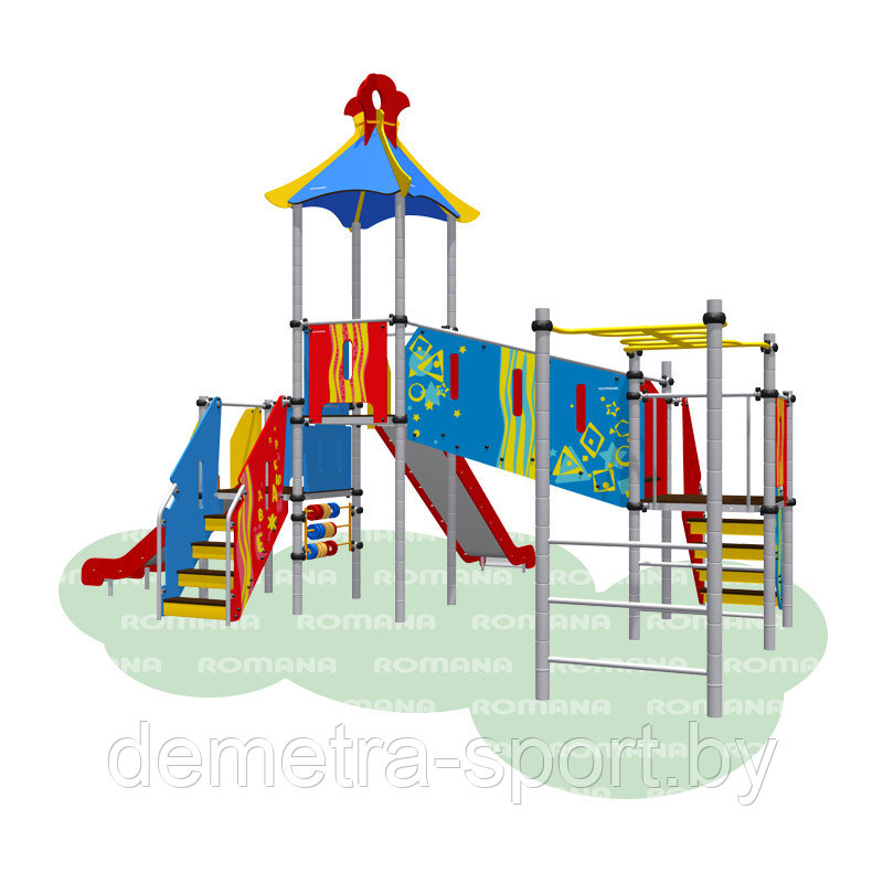 Детская площадка «Romana 101.09.00» - это комплекс горками, различными лестницами, турниками, рукоходами и переходом. Хорошо развивает координацию и ловкость у детей, укрепляет мышцы. Подходит для любых детских игровых площадок.