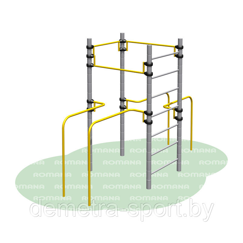 Спортивный комплекс 204.03.00 состоит из шведской стенки, брусьев разной высоты и турников разной высоты. Подходит для установки на спортивной площадке, детском лагере, во дворе и оздоровительных центрах.